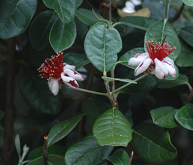 Acca sellowiana, known as pineapple guava, is an evergreen shrub valued for its gray-green foliage and edible fruit. Its red-stamen flowers add strong visual structure during bloom.