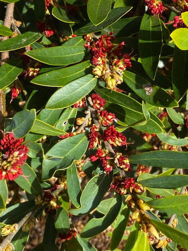 Color: The flowers are red, creating a contrast with the dark green to bluish-green foliage. The foliage is evergreen, providing year-round interest.