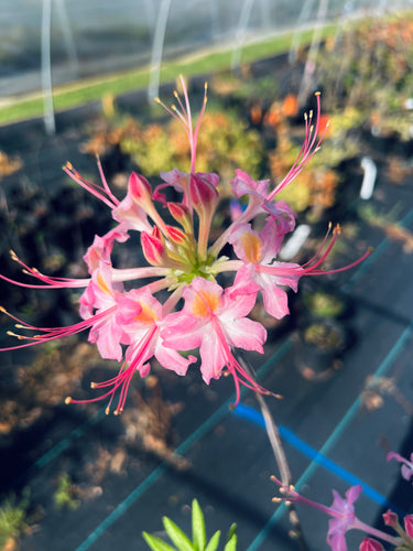 'Addison' is a tall-growing, open deciduous native azalea from Rhododendron alabamense (which see) seed. It is surely a hybrid but exact parentage is unknown. It was first named 'Stunning' because that describes the large dense multi-colored terminal clusters of flowers which show shades of yellow, pink, and white. It was selected by our good friend Charles Webb in Florida. It is named for one of his young grandaughters.