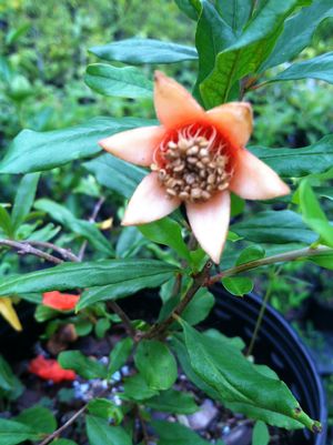 Pomegranate is a deciduous Middle-eastern shrub with small, narrow leaves, orange flowers, and orange-red large edible fruits for which it has been cultivated since ancient times.