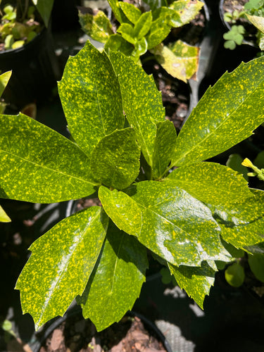 'Shilpot' (sometimes written as 'Pepper Pot' in the UK trade) is a compact male clone selected for the way the foliage looks like someone shook a salt-shaker of butter-yellow paint over each glossy leaf — fine, dense, uniformly distributed yellow speckling rather than the broad blotches of older variegated cultivars. The pattern is precise and almost confectionary. As a male cultivar, 'Shilpot' produces no berries itself — but it is exactly what you plant near the female aucubas ('Rozannie', 'Picturata', the species itself) to coax their dramatic red drupes out of dormancy. One male will service multiple females within a reasonable distance.
