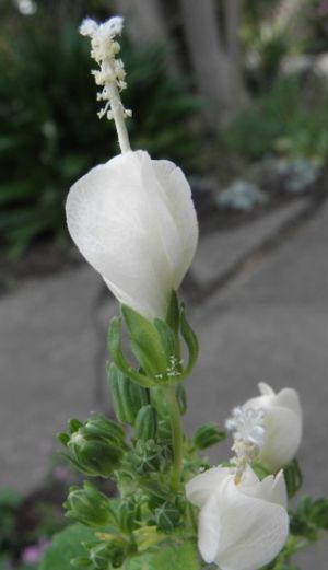 A white-flowered form of the normally red-flowered Malvaviscus drummondii (which see) that was given to us by Greg Grant of the Stephen F. Austin Arboretum in Nacogodoches, TX. This Hibiscus relative is native to the Gulf Coast states and southward, but widely grown elsewhere.