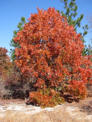 This scrub oak produces glossy, deeply lobed leaves that grow upright. The foliage turns a deep red in late fall, providing reliable seasonal color in poor soil conditions.