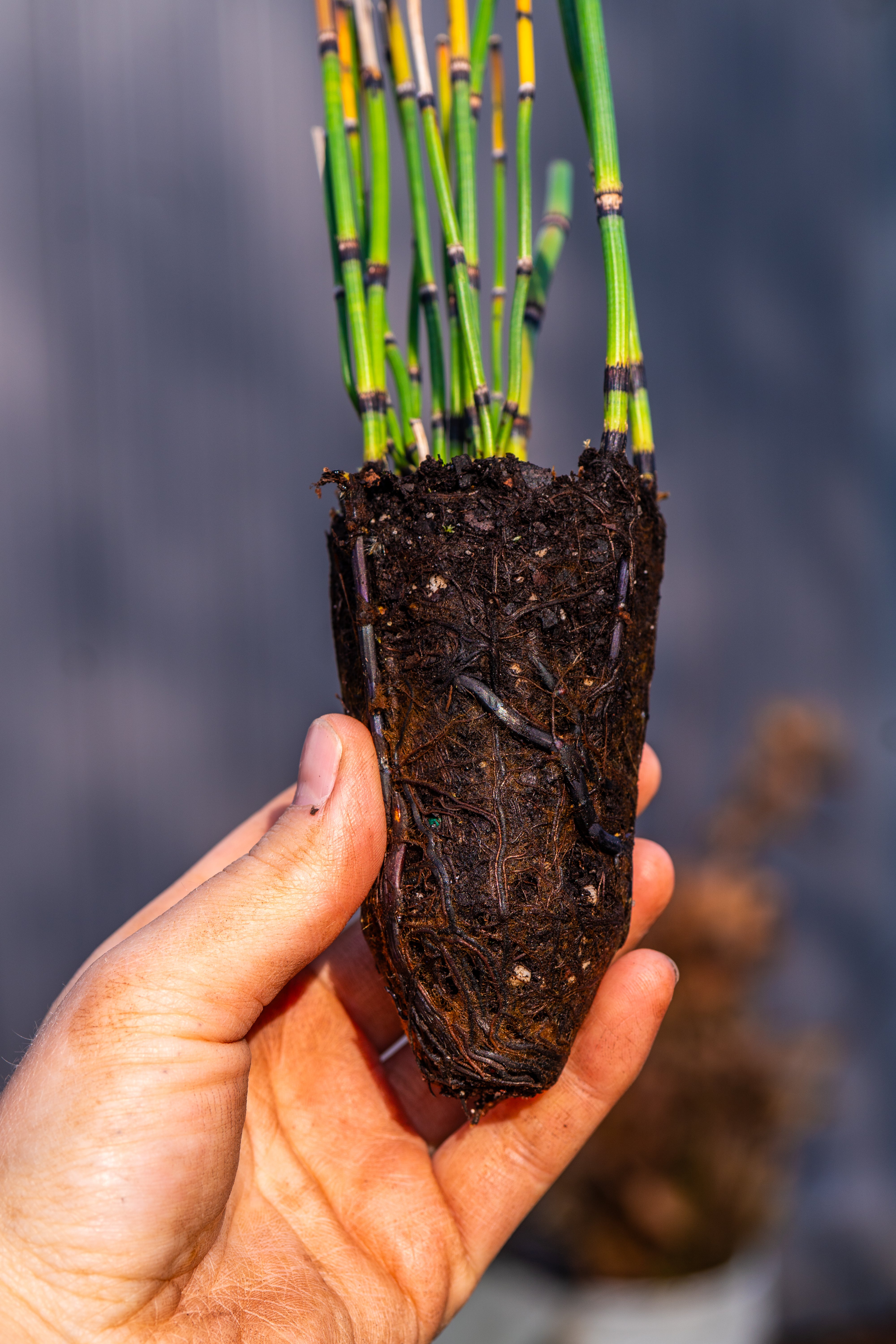 An ancient, striking species with prehistoric charm, Equisetum hyemale brings bold vertical structure to the garden with its deep green, bamboo-like stems and year-round presence. It thrives where soils remain consistently moist, lending clean lines and a distinctly architectural character to rain gardens, pond edges, and wet borders. Graphic, textural, and quietly dramatic, it is the backbone of the planting even when little else is in bloom.